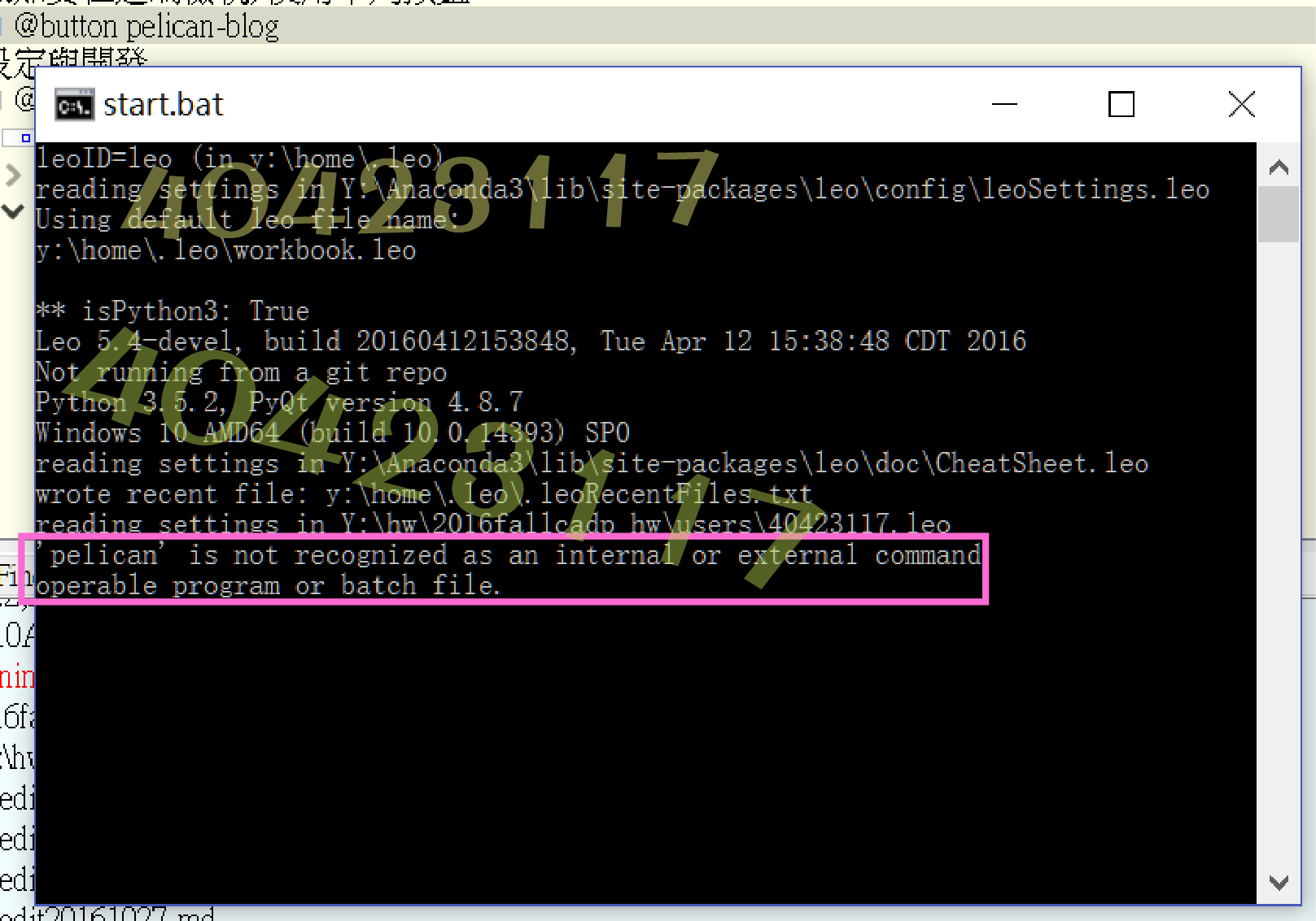 剛剛使用今年新版的[ana2016fall_08],開啟 LeoEditor之後,要在近端觀看倉儲網誌時,發現都沒有更新我所改的內容,故到 Start.bat 內查看問題,後來解決了問題一之後,又跑出沒有安裝markdown模組,所以又安裝了,之後便暢行無阻~~ happy :)